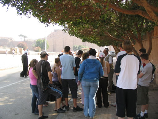 Gallery_of_Past_Visits/Students gather in the shade for a talk by Hany before entering Karnak Temple - is this really December.JPG